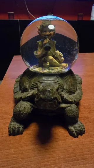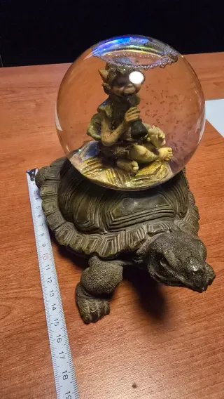 Figura decorativa de un duende dentro de una bola de cristal llena de agua y purpurina/brillantina. - Base con forma de tortuga detallada. - El duende toca un instrumento musical.