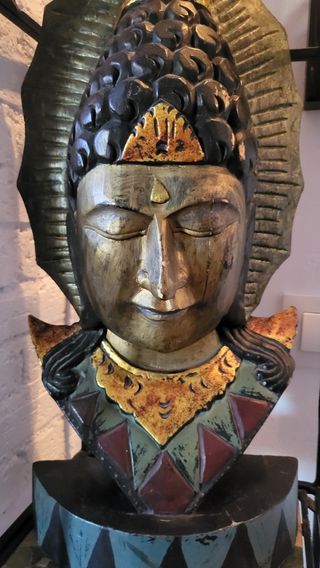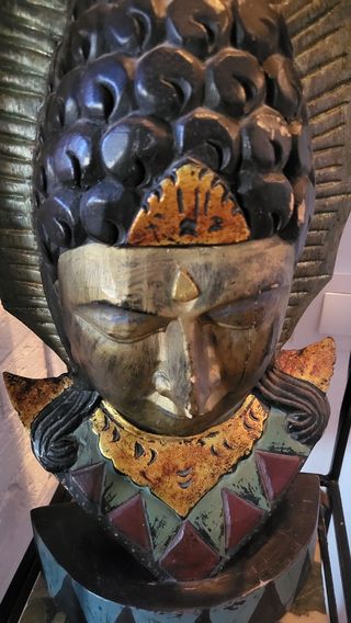 Figura decorativa de Buda, elaborada en madera con un diseño tallado. - Detalles en dorado y colores vivos. - Base con diseño geométrico.