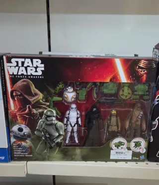 Set de figuras de Star Wars: The Force Awakens. Incluye varios personajes y accesorios. - Figuras de BB-8, Kylo Ren, Chewbacca, Stormtrooper y Resistance Trooper. - Accesorios de juego. - Licencia oficial de Disney.