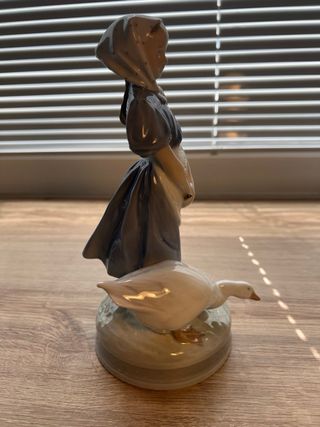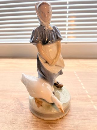 Figura de porcelana de una mujer con un ganso. Una pieza decorativa con un diseño encantador. - Fabricada por Royal Copenhagen. - Representa a una mujer con un pañuelo en la cabeza y un delantal. - Un ganso blanco está a sus pies. - Numero 527