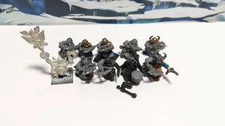 Conjunto de figuras de enanos ballesteros, ideales para coleccionistas o juegos de mesa. - Portaestandarte de montaraces de metal. - 10 miniaturas - Variedad de poses y armamento. - Incluyo peanas faltantes.