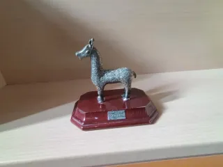 Figura decorativa de estilo ecuestre, inspirada en la cultura micénica. Presenta un diseño detallado y ornamentado. - Material: Metal - Base de madera pulida