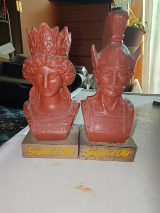Conjunto de dos figuras decorativas de Gegants d'Olot. - Representación en figuras de los gegants d,Olot ( gigantes de Olot) - Base de madera con inscripción. - data del año 1971 -la gegantesa tiene alguna marca de uso , ( fotos cabeza) Medidas gent 17cm gegantesa 16 cm en general, en buen estado 40€ la pareja o 30€ / unidad # vest