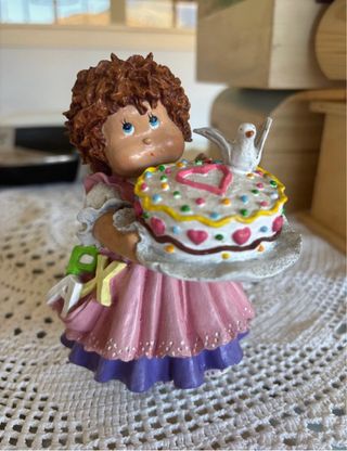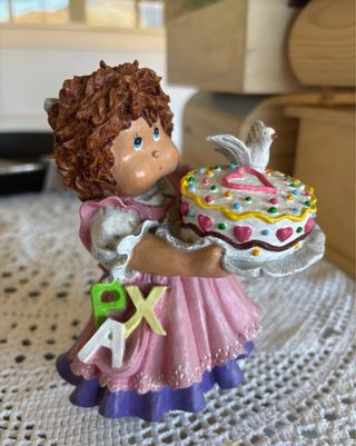 Figura decorativa de una niña con un pastel. - El pastel tiene un corazón rosa y un pájaro blanco encima. - La figura lleva letras decorativas en la falda.