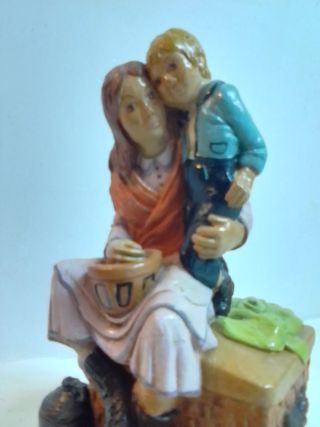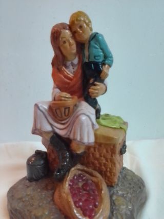 Figura decorativa antigua de madre e hijo. Representa un tierno momento entre ambos. Episodios de pesebre singular o para coleccionismo. Mide de alto 22 cm. Y está en perfecto estado. Pieza original años 70. Ver más figuras antiguas o de carácter religioso en mi perfil. Hago envios. - Detalle de vestimenta y peinado. - Base con elementos decorativos.