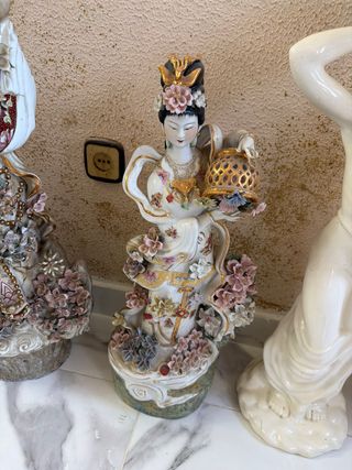 Elegante figura de porcelana representando una geisha. Detallada con flores y adornos dorados. - Figura de porcelana. - Diseño con flores. - Detalles en dorado. 50 euros la unidad
