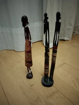 Figuras africanas de madera en buen estado. Necesitan algo de limpieza por el polvo acumulado. Medida: 30 cm de altura aproximadamente