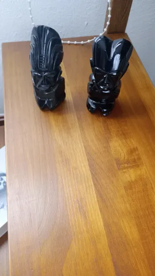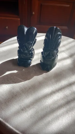 Par de figuras talladas en obsidiana negra. - Material: Obsidiana. - Diseño: Figuras con rostros y tocados. - Color: Negro brillante.