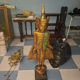 Estatua de Buda de madera con acabado dorado y detalles en verde. Mide 1,25 - Diseño intrincado. - Base de madera oscura. Preguntar precio.