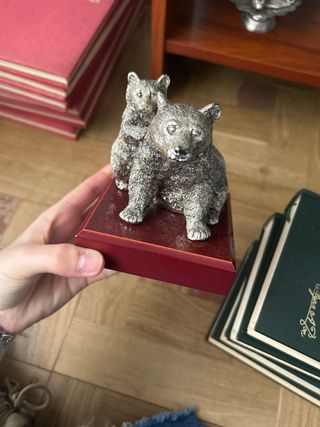 Preciosa figura decorativa de dos osos, una madre con su cría. - Material: Metal plateado. - Base: Madera oscura. - Diseño detallado.