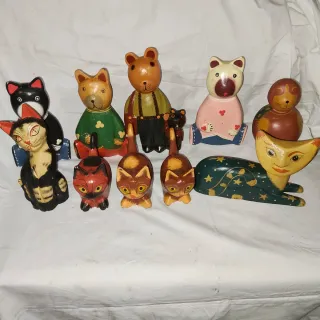 Conjunto de figuras decorativas de madera, pintadas a mano. - Diseños variados de animales. - Acabados coloridos y detallados. - también se pueden vender por separado des 5 a 8€ - Altura desde 13 a 24,5