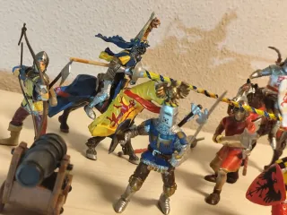 Conjunto de figuras de caballeros medievales, incluyendo un dragón y un cañón. - Figuras de caballeros con armaduras y espadas. - Un caballero dragón con detalles. - Romano lancero - Cañon *UN CABALLERO TIENE LA MANO ROTA Y EL ARQUERO TIENE LA CUERDA ROTA. SE PUEDEN PEGAR Son juguetes medievales de marca Plastoy o Papo #playmobil #lego