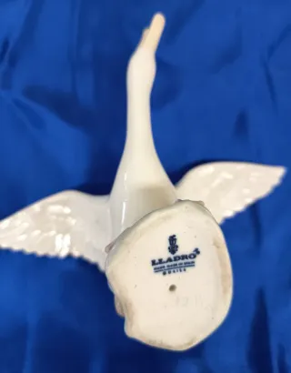 Elegante figura de porcelana de un cisne blanco de Lladro. Representa un cisne con las alas extendidas, como si estuviera en pleno vuelo o a punto de despegar. - Diseño detallado de las plumas. - Base texturizada que simula agua o vegetación. MEDIDAS 17 x 15