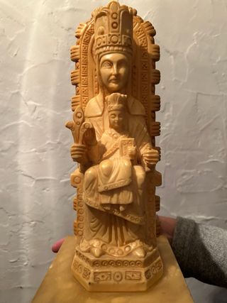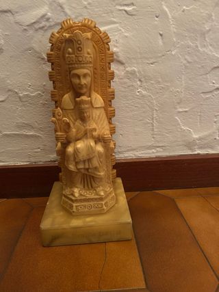 Figura religiosa de la Virgen de Ujué. Representa a la Virgen con el Niño Jesús en brazos. - Material: Resina o similar. - Base decorada con inscripciones. - Estilo clásico.