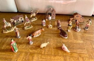 Conjunto de figuras de Belén muy antiguo con diversos personajes tradicionales y elementos arquitectónicos. Modelos elaborados a mano y colores pintados a mano. Las construcciones incluyen una casa y un pozo, que aportan realismo a la escena y los pequeños detalles como ramas en el pozo sugieren un trabajo artesanal minucioso. Los belenes de esta naturaleza comenzaron a popularizarse en Europa durante los siglos XVIII y XIX, y su producción artesanal cobró auge en países como España, Italia y Alemania. De gran interés tanto por su valor histórico-cultural y sentimental y de interés para coleccionistas de figuras navideñas.