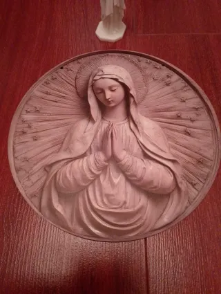 Conjunto de figura religiosa y disco decorativo. - Figura de Jesús. - Disco con imagen de la Virgen María.