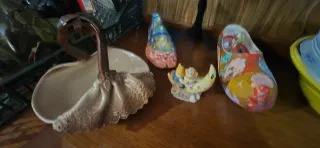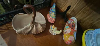 Conjunto de artículos decorativos para el hogar. - Figura de zapato pintado a mano. - Figura de zapato con diseño colorido - Figura de ángel sobre luna. - Cuenco decorativo de cerámica.