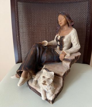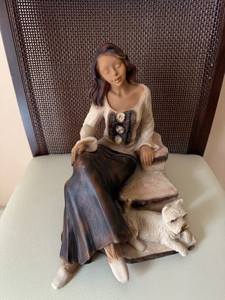 Figura decorativa de una mujer sentada con un perro a sus pies. La pieza tiene un diseño detallado y elegante. Alto 25 cm. Ancho 20 cm. Negociable