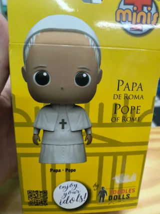 Figuradel Papa Francisco de la serie Minis. - Diseño estilizado tipo Funko Pop. - Representación del Papa con vestimenta religiosa. - Caja con diseño llamativo y texto Papa de Roma. - Incluye frase Enjoy your idols!. - Fabricado por Toodles Dolls.