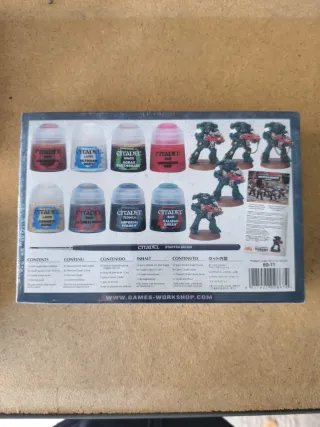 Kit de inicio para Warhammer 40,000 que incluye pinturas y figuras. - Caja de pinturas Citadel. - Incluye 6 botes de pintura: 1x Ushabti Bone, 1x Leadbelcher, 1x Agrax Earthshade, 1x Caliban Green, 1x Mephiston Red, 1x Nuln Oil. - Pincel Citadel Starter Brush. - 3 figuras de Space Marines. - precintada