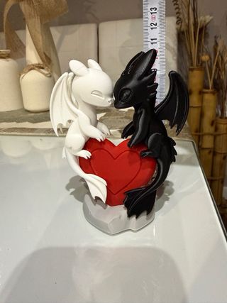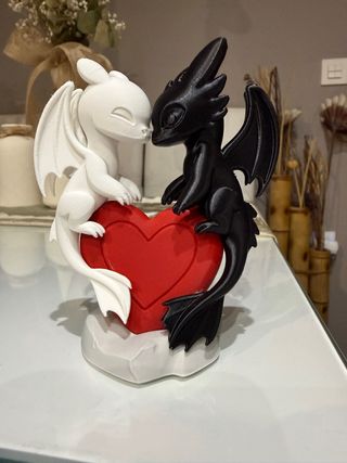Figura decorativa de dos dragones, uno negro y otro blanco, unidos por un corazón rojo. Ideal para coleccionistas o como regalo. - Diseño inspirado en Cómo entrenar a tu dragón. - Fabricada mediante impresión 3D. - Con base.