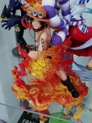 Set de figuras de colección de One Piece, con personajes dinámicos y llenos de acción. Con caja - Figura de Yamato con su ataque de hielo. - Figura de Ace rodeado de llamas. - Base detallada con efectos de poder.