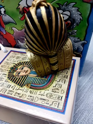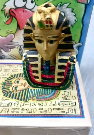 Figura decorativa de un faraón egipcio, ideal como recuerdo. - Diseño detallado con tocado y collar. - Base con jeroglíficos y rostro de faraón. - Colores dorados, negros, rojos y verdes.