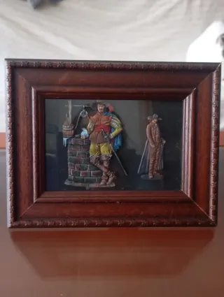 Cuadro decorativo con figuras planas pintadas a mano. - Marco de madera oscura. - Escena con dos figuras planas del capitán alatriste - Detalle de pozo y barril. Medidas: 10×15 Cm