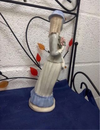 Figura de porcelana de una mujer con un ramo de flores, estilo años 80. bien conservada con una altura de 26 cm - Detalle de vestido blanco con volantes azules. - Sombrero azul. - Guantes blancos.