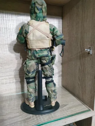 Figura de soldado militar con uniforme de camuflaje. - Incluye gorro negro. - Porta un rifle. - Chaleco táctico con accesorios. - Rodilleras. - Base de exposición. Escala 1.6