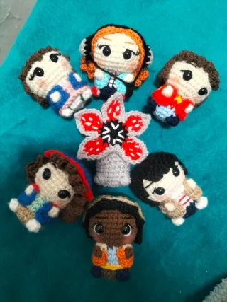 Conjunto de figuras de crochet inspiradas en la serie Stranger Things, incluyendo al Demogorgon. - Figuras de personajes principales. - Demogorgon detallado. - Hecho a mano con hilo. - Ideal para coleccionistas. 10€ cada figura 50€ la colección completa