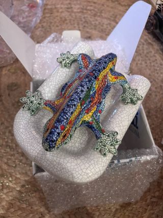 Figura decorativa inspirada en el famoso lagarto de Gaudí en Barcelona. Una pieza única para coleccionistas y amantes del arte. - Diseño colorido y detallado. - Base blanca con acabado craquelado. Solo abierta para hacer las fotos.