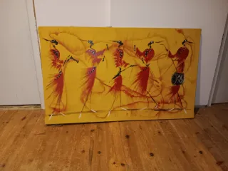 Cuadro decorativo de arte africano. Representa figuras danzantes sobre un fondo vibrante. Cuadro de arte africano. Comprado en persona en Marruecos. Medidas 100cm x 59 cm. - Motivo: Figuras humanas estilizadas en movimiento. - Colores predominantes: Amarillo y rojo. - Estilo: Abstracto, tribal.