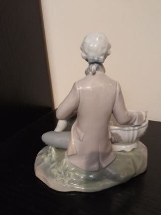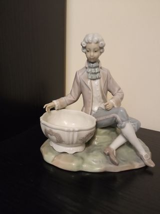 Figura de porcelana de Lladro. - Diseño detallado de un joven con vestimenta de época. - Base con forma de roca y un cuenco decorativo. En perfecto estado