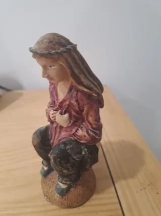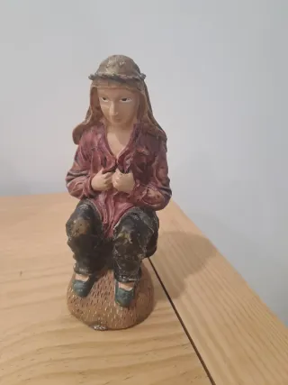 Figura decorativa para belén, representando a una persona sentada. - Detalle de corona de espinas en la cabeza. - Vestimenta en tonos rojizos y oscuros. - Base texturizada.