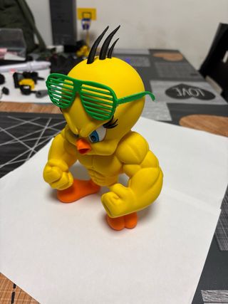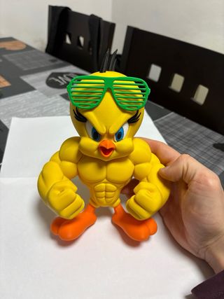 Figura coleccionable de Piolín con un diseño musculoso y gafas de sol. - Altura aproximada de 23 cm. - Color amarillo vibrante. - Gafas de sol verdes. - Detalle de plumas negras en la cabeza.