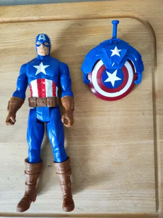 Figura articulada del Capitán América de aproximadamente 30 cm de altura. Incluye su icónico escudo. - Figura de Capitán América. - Escudo del Capitán América.