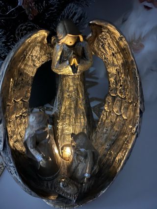 Figura decorativa para belén con un acabado dorado y detalles que evocan la tradición. - Diseño con ángel y figuras. - Incorpora luz para crear ambiente.