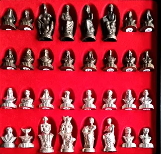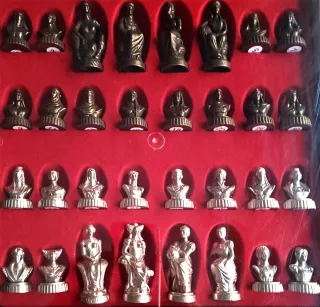 Juego de Ajedrez de damas antiguas con temática de Moros y Cristianos formado por 32 piezas de metal con dos alturas 4 cm y 6,5 cm. Las figuras presentan buen peso detalles valo marcados y una estética histórica que destaca tanto para jugar como para decorar. El estuche de 30 x 30 cm integra el tablero en la parte trasera, lo que permite guardarlo todo de forma compacta y transportarlo fácilmente. Conjunto nuevo, ideal para colesionistas, amantes de los juegos clásicos o quienes buscan una pieza especial con carácter tradicional y valor decorativo.
