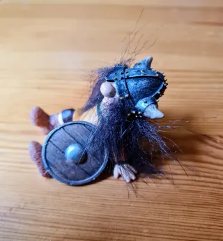 Figura decorativa de un Troll ataviado con ropa de Vikingo, con todos los detalles. Comprado en Islandia hace 10 años. Mide 5cm de alto - Detalle de casco con cuernos. - Cabello largo y negro. - Lleva un escudo redondo de madera.