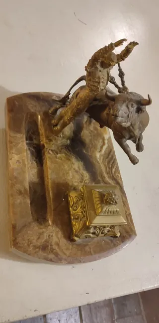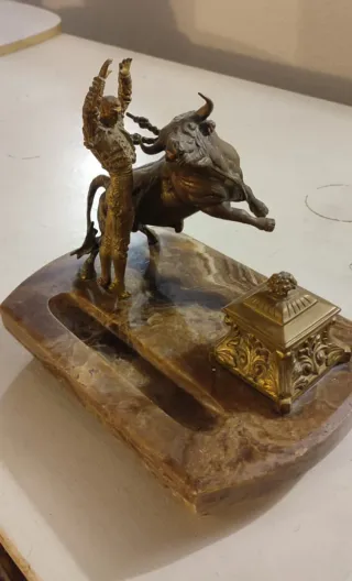 Antiguo tintero con una escena de tauromaquia. Década 40 ó 50 Base es de mármol veteada: 30 x 19. Grosor 2,5 cm Figura de bronce de un torero y un toro Alto 19,5 x ancho 16,5 cm Patas 2,5 cm Altura total 25,5 cm Pesa bastante. Una vez empaquetado pensaré el paquete para ajustar el peso en el envío