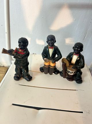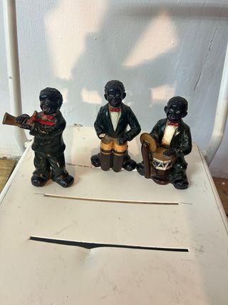 Conjunto de tres figuras decorativas de negritos músicos. Cada figura representa a un músico con un instrumento. - Figura con trompeta. - Figura con pandereta. - Figura con tambor.