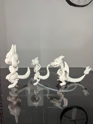 Conjunto de tres figuras de estilo esqueleto, inspiradas en personajes de Pokémon. Son de color blanco y tienen un acabado mate. -tamaño: 8-13,5cm - Diseño detallado. - Material: Plástico.
