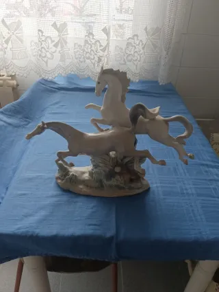 Elegante figura de porcelana de la reconocida marca Lladro. Representa un grupo de caballos en movimiento, capturando la gracia y la fuerza de estos animales. Falta casco de dos patas, resto impecable. - Material: Porcelana. - Diseño detallado y artístico.