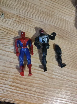 Set de figuras articuladas de Spider-man y Venom. La figura de Venom tiene una pierna suelta, es reparable. Spider-man está en buenas condiciones. - Figura de Spider-man con traje rojo y azul. - Figura de Venom con traje negro y blanco. - Una pierna suelta de Venom.