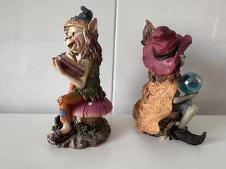Conjunto de dos figuras decorativas de elfos, con un diseño detallado y fantasioso. - Elfo leyendo un libro sentado en un hongo. - Elfo con sombrero, escoba y bola de cristal. - Realizados en resina. - Medidas en las fotos.