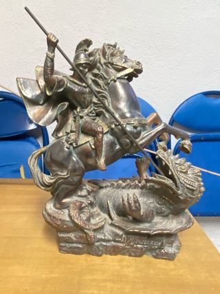 Detallada figura que representa a San Jorge luchando contra un dragón. La pieza muestra una gran maestría en su diseño. - material, resina acabado bronce - Representación de San Jorge y el dragón. - Firma del artista MENJERRICH en la base