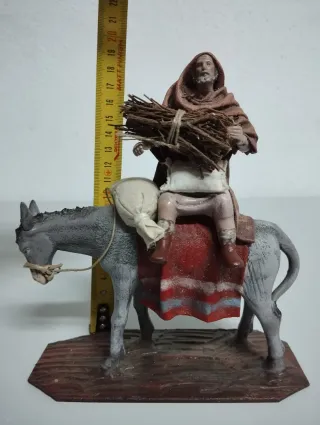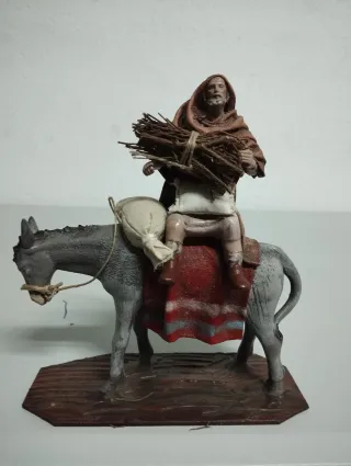 Figura artesanal para Belén, representando a un hombre con un burro cargado de leña. - Figura de barro y trapo. - Figura de hombre con túnica y capucha. - Burro gris con saco. - Carga de leña atada. - Figura de 12 / 13 cm.