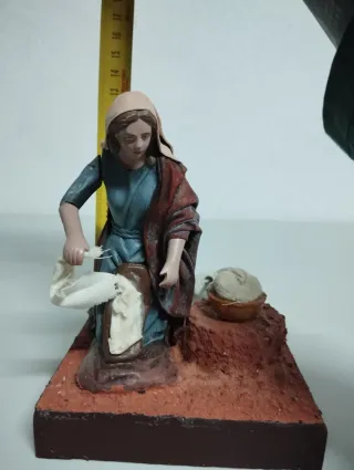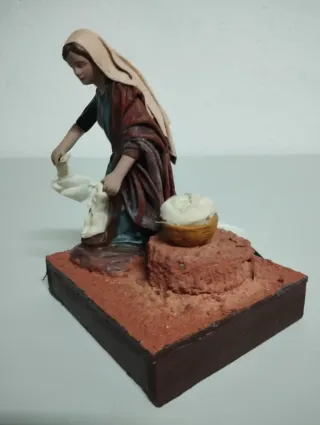 Figura artesanal para belén de una mujer lavando ropa. Representa una escena tradicional. - Figura de movimiento. - Figura de 12 cm. - Figura de mujer con vestimenta tradicional. - Sostiene tela para lavar. - Base con textura de tierra y cesta con ropa. - Barro y trapo. - Se escucha el motor, pero NO funciona.
