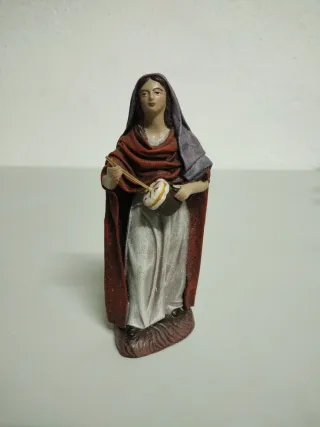 Figura de un belén que representa a una mujer tocando un tambor. - Detalle de vestimenta tradicional. - Base texturizada. - Barro y trapo. - 13 cm